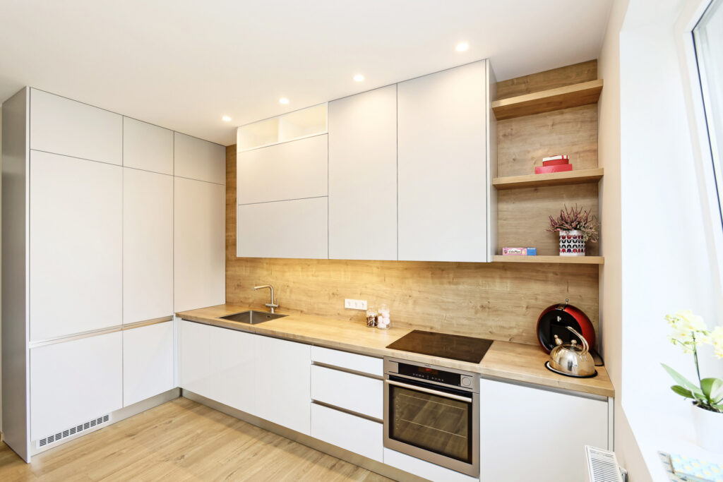 Stūra virtuve ar baltām akrila fasādēm piedāvā tīru un mūsdienīgu izskatu, savukārt kombinācija ar zeltīta toņa akrila fasādēm piešķir telpai luksusa akcentu.