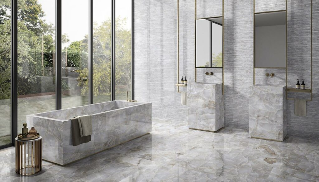 Gaismas atspīdums flīzēs telpu vizuāli padarīs plašāku. Lai līdzsvarotu spīdīgas flīžu virsmas vannas istabā, vēlams izmantot flīzes vannas istabai ar matētu faktūru.