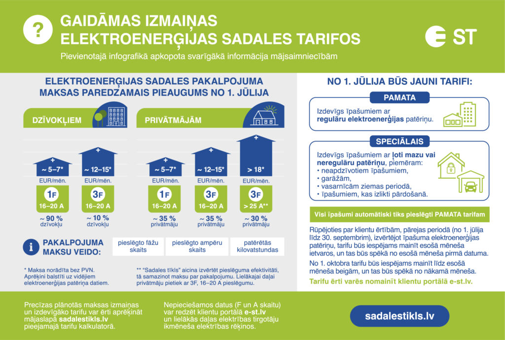 Lai nodrošinātu ikvienam iespēju iepazīties ar paredzamo maksājuma summu savā īpašumā, “Sadales tīkla” mājaslapā ir pieejams gan plašāks skaidrojums, gan tarifu kalkulators. Ievadot tajā datus par īpašumam pieslēgto fāžu un ampēru skaitu, kā arī vidējo elektroenerģijas patēriņu mēnesī, ikviens var uzzināt maksājuma summu.