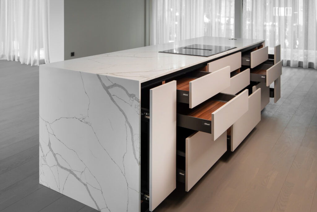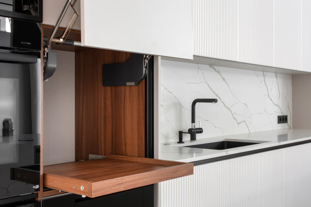 Mūsu izvēle attiecībā uz profilrokturiem melnā tonī, skapīšiem kas strādā uz pieskārienu sistēmu “TipOn”, un “Blum” Antaro Orion atvilktnēm ar kluso aizvēršanās sistēmu uzlabo ikdienu, padarot virtuves lietošanu ērtāku un vienkāršāku, protams arī klusāku! Šīs funkcijas nozīmē, ka jums būs plūstoša un dinamiska darbošanās virtuves telpā.