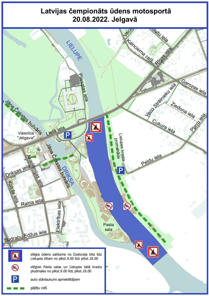 Sestdien, 20. augustā, Lielupē notiks Latvijas ātrumlaivu čempionāta 4. posms. Drošības apsvērumu dēļ sacensību dienā no pulksten 9 līdz aptuveni pulksten 18 iedzīvotājiem nebūs pieejama ne Pasta salas, ne Lielupes labā krasta pludmale, kā arī šajā laikā būs slēgta ūdens satiksme Lielupē no auto tilta līdz dzelzceļa tiltam, informē Jelgavas pašvaldības Sabiedrisko attiecību pārvaldē.