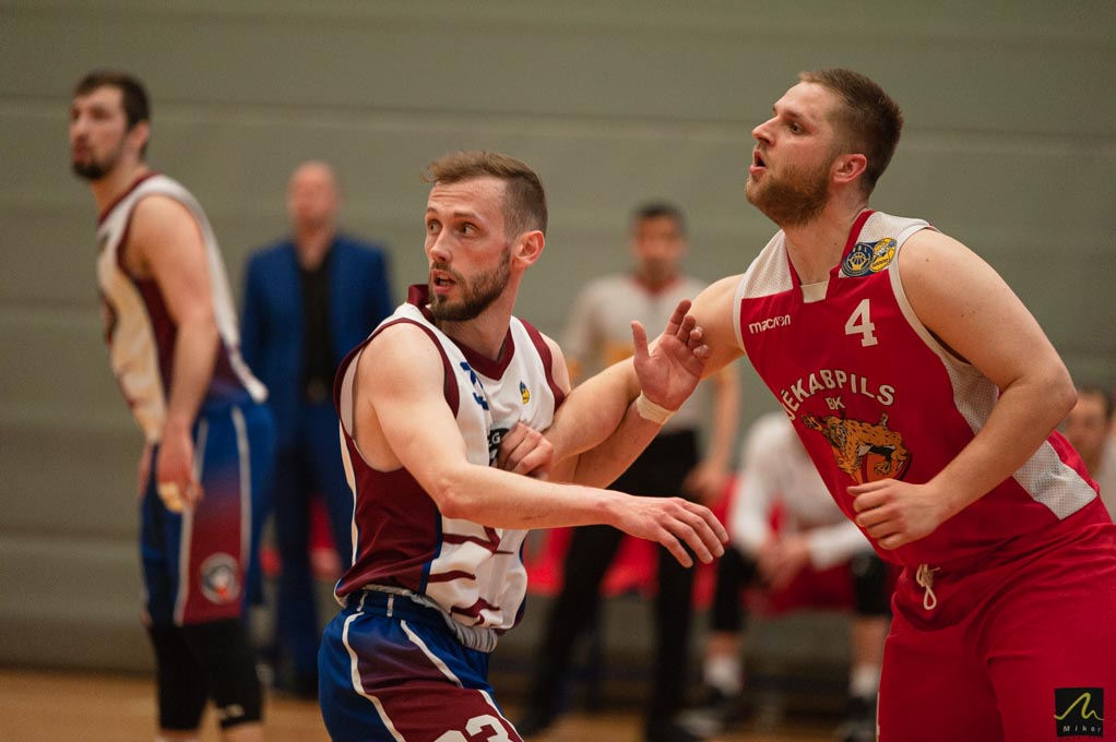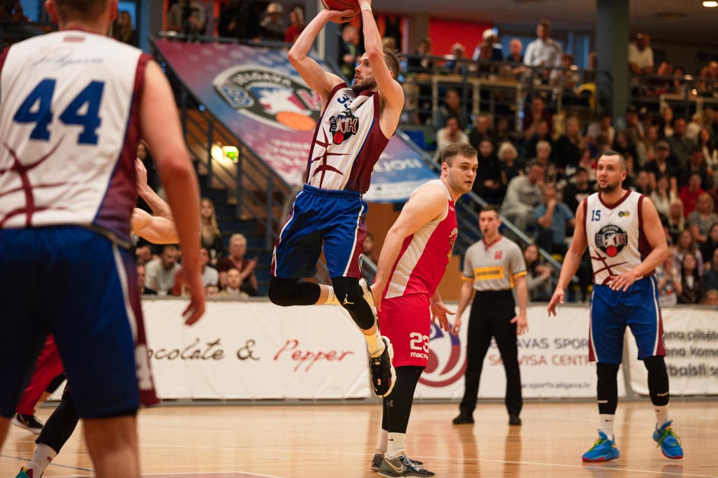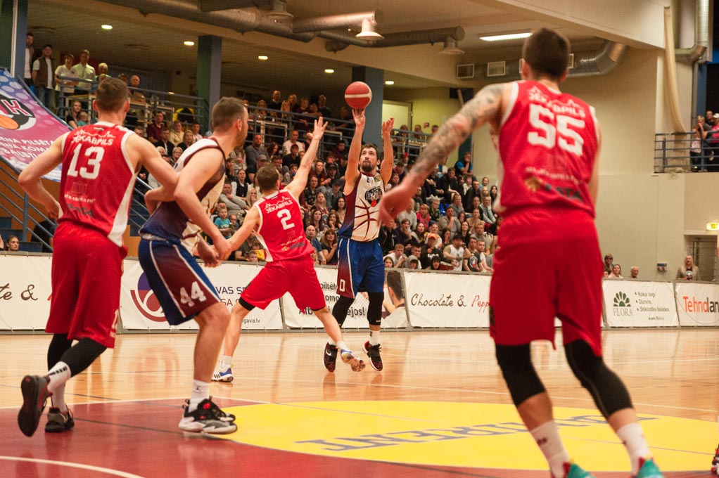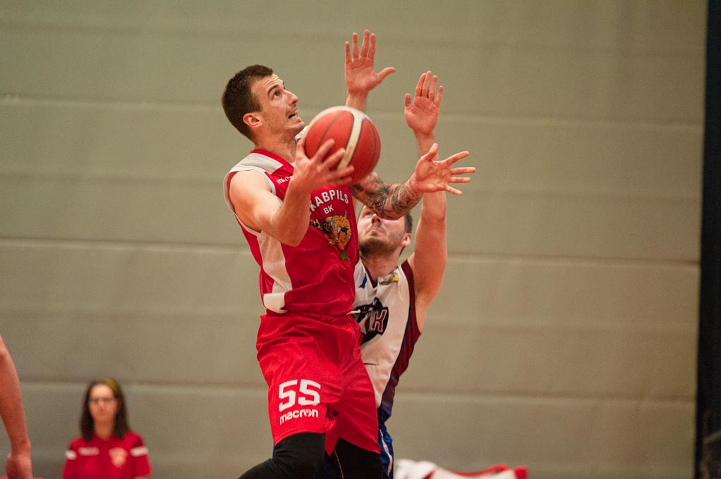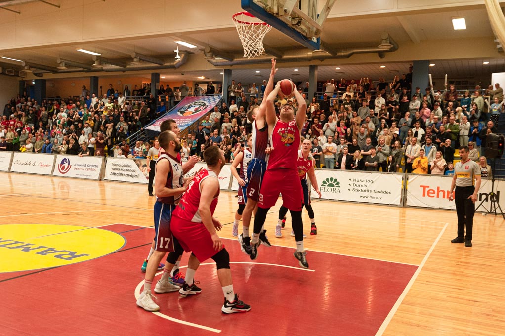 Spēles pirmajā ceturtdaļā ritēja līdzīga cīņa. Viesi uz brīdi pārņēma vadību ar +5, taču mājinieki atspēlējās un pirmo ceturtdaļu noslēdza ar 24:23. Otrajā ceturtdaļā mūsu vīri vēl nedaudz spēja palielināt pārsvaru – 23:16. Lieliski laukumā darbojās saspēles vadītājs Kristaps Pļavnieks, kurš ne tikai apgādāja partnerus ar lieliskām piespēlēm, bet arī pats guva punktu pēc punkta. Pēc puslaika rezultāts uz tablo vēstīja 47:39.
