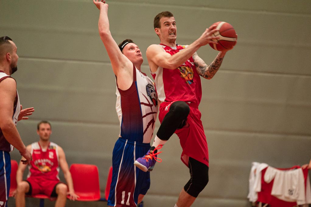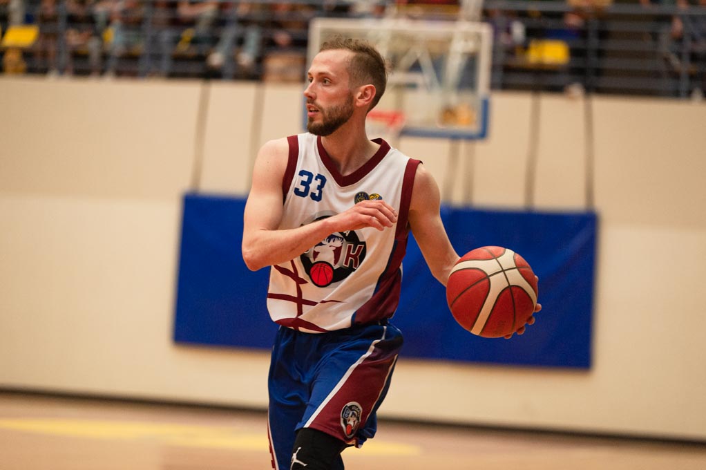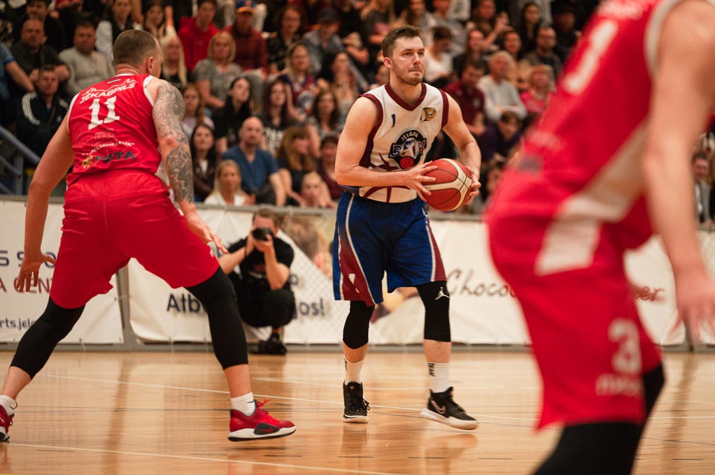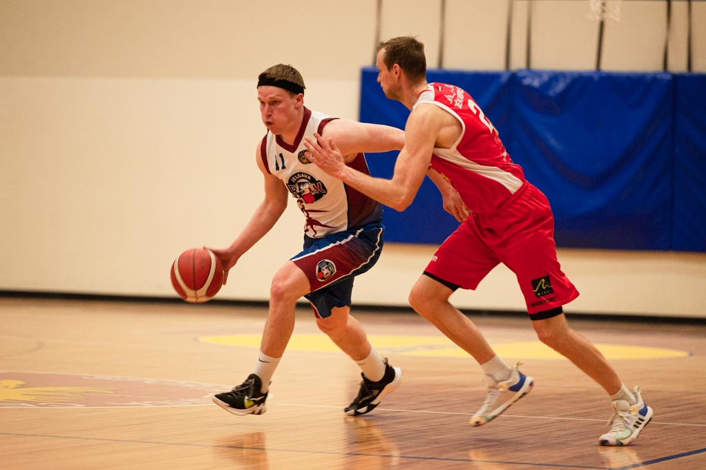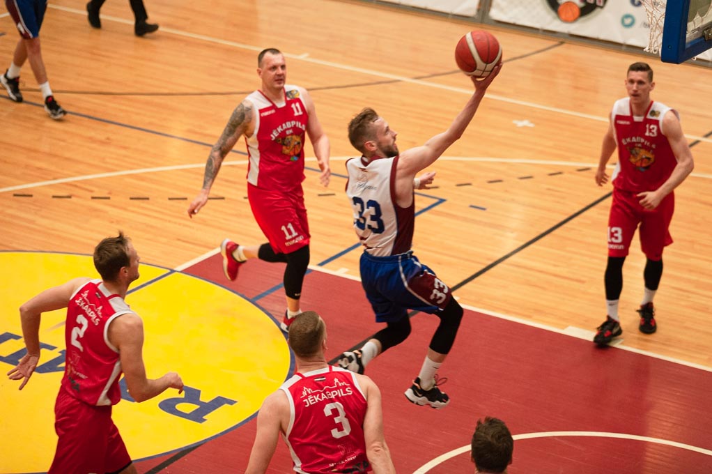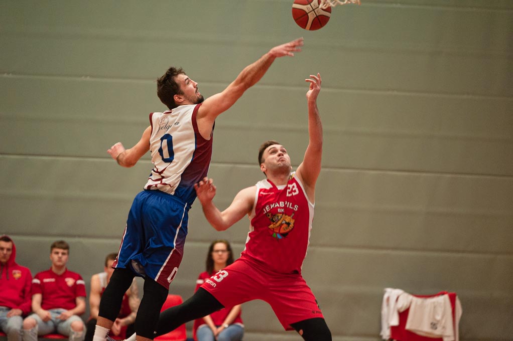 Spēles pirmajā ceturtdaļā ritēja līdzīga cīņa. Viesi uz brīdi pārņēma vadību ar +5, taču mājinieki atspēlējās un pirmo ceturtdaļu noslēdza ar 24:23. Otrajā ceturtdaļā mūsu vīri vēl nedaudz spēja palielināt pārsvaru – 23:16. Lieliski laukumā darbojās saspēles vadītājs Kristaps Pļavnieks, kurš ne tikai apgādāja partnerus ar lieliskām piespēlēm, bet arī pats guva punktu pēc punkta. Pēc puslaika rezultāts uz tablo vēstīja 47:39.