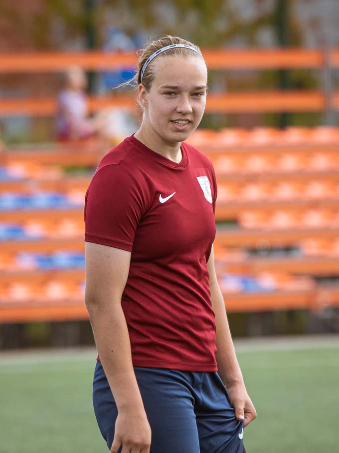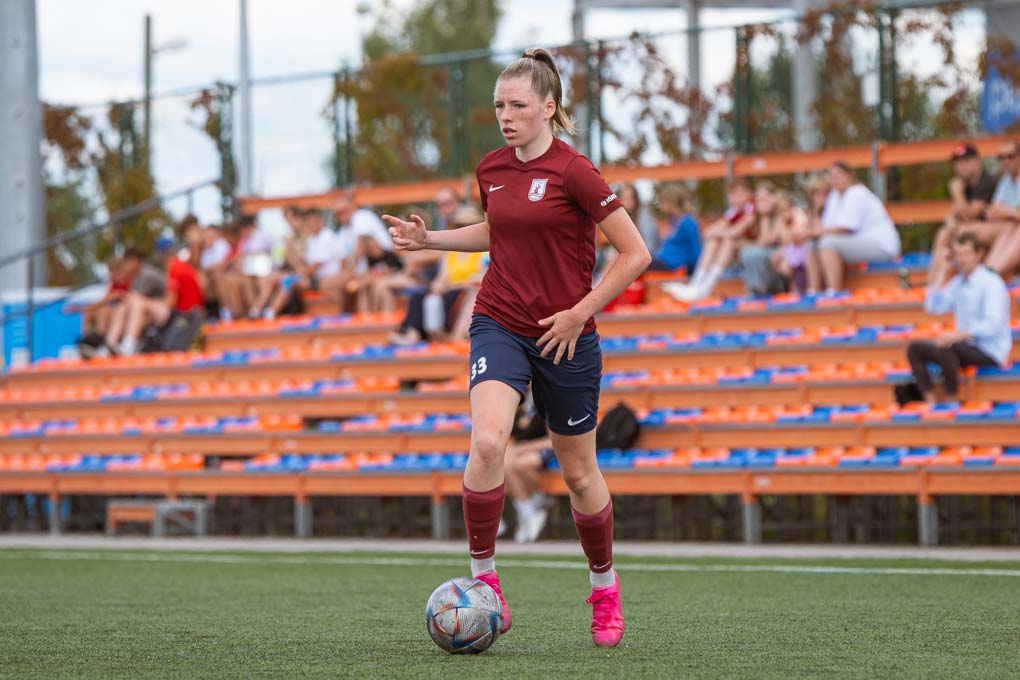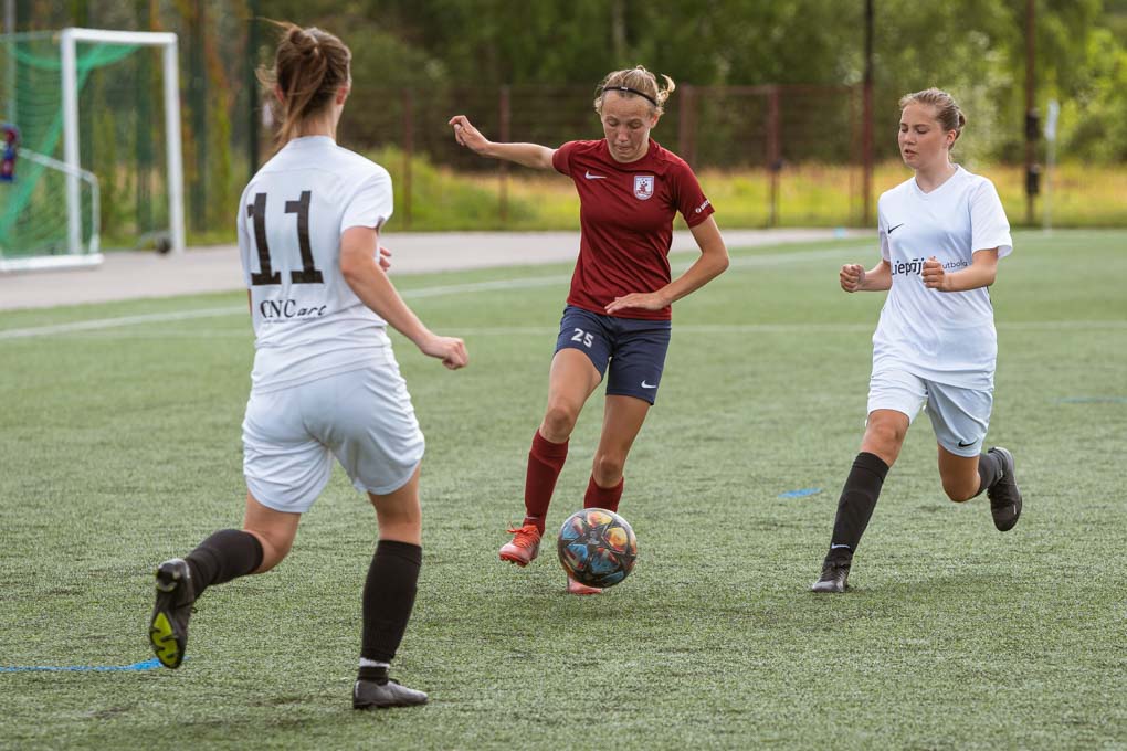 Pirmā puslaika gaitu iezīmēja “FK Jelgava” kreisās malas pussardze Alise Keita Baltrušaite, Latvijas U-17 izlases dalībniece, kura atklāja spēles rezultātu 7. minūtē – 1:0. Alisei ir liels ātrums, tehniskas kustības un labas spējas pārredzēt laukumu. Visas šīs spējas viņa izmantoja šajā spēlē.
