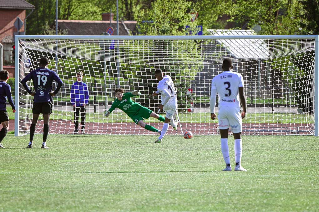 33. minūtē viesu uzbrucējam Usenū Niangam izdevās apsteigt aizsargus un Roberts Čevers soda laukumā mēģināja izsist viņam bumbu, bet trāpīja pa kājām, kas maksāja “FS Jelgava” ar 11 metru soda sitienu. Vārtsargam Raivo Stūriņam neizdevās atminēt Duglasa Aurelio sitiena virzienu un “Riga FC” izvirzījās spēles vadībā – 0:1.