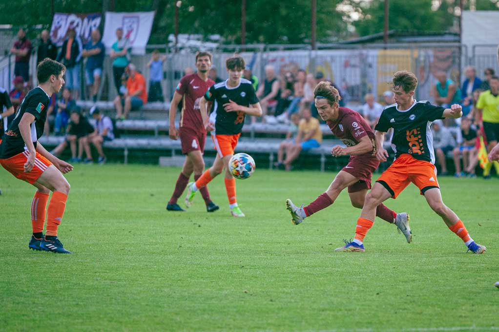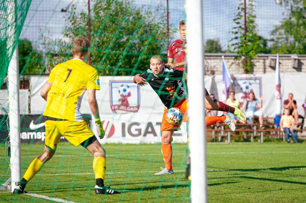 Pirmā puslaika noslēgumā jelgavnieki Ralfs Maslovs un Kristers Skadmanis ar lieliskām piespēlēm apspēlēja pretinieka aizsargus. Kristers izdarīja sitienu uz vārtiem, kā rezultāta bumba trāpīja viesu aizsarga kājā un uzlidoja augstu gaisā uz vārtu priekšu. Ilgi negaidot ar lēcienu pāri sevi Rihards Bečers ieraidīja bumbu vārtu tīklā – 1:0.