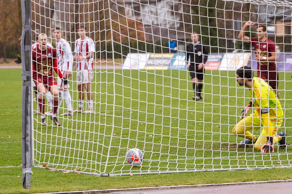 “FS Jelgava” futbolists Artūrs Janovskis atklāj spēles rezultātu, ieraidot bumbu “FK Liepāja” vārtos.