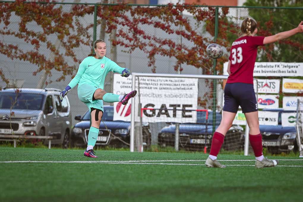 Vienīgos vārtus “FS Jelgava” labā 73. minūtē no brīvsitiena guva aizsardze Denīze Marta Medinika. Denīze sita no laukuma kreisās puses, atrodoties aptuveni 30 metru attālumā no vārtiem. Pēc ballistiskās trajektorijas raidītā bumba, pārlidoja pāri neliela auguma vārtsardzei Mariannai Perepečai, lai nolaistos vārtu labajā pusē – 1:3.