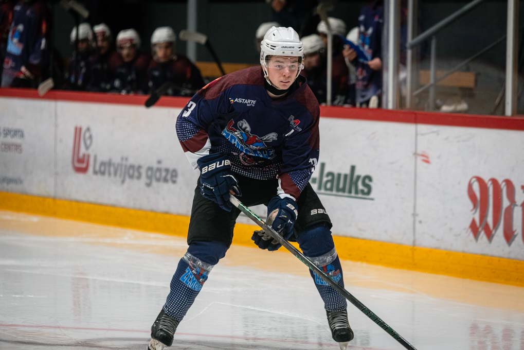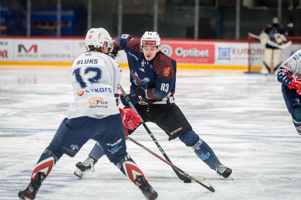 “JLSS” uzbrucējs Kārlis Gustavs Mendziņš laužas cauri “HK Prizma” aizsardzībai
