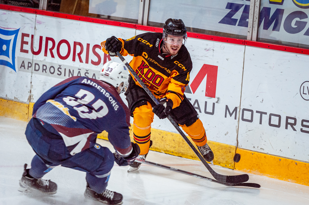 Trešās trešdaļas sākumā, spēlējot vairākumā, “KOOVEE” hokejistiem izdevās realizēt ātro vārtu gūšanas plānu, kuru viņi jau mēģināja realizēt spēles sākumā. Uzbrucējs Santu Hakanens no savas aizsardzības zonas atdeva tālo piespēli komandas biedram Oku Kangasniemi uz jelgavnieku aizsardzības zonas zilo līniju. Oko precīzi apstrādāja ripu un spēja izrauties aiz laukuma saimnieku mugurām un izslīdot viens pret viens ar Rihardu Cimermani – 1:2.