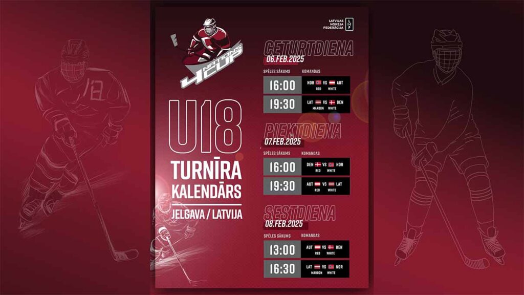 6.–8. februārī Jelgavas ledus hallē norisināsies starptautisks Četru nāciju turnīrs, kurā sacentīsies Latvijas, Dānijas, Austrijas un Norvēģijas U-18 hokeja izlases. Šis turnīrs kalpos kā sagatavošanās posms pirms aprīlī gaidāmā Pasaules čempionāta elites divīzijā, kas norisināsies ASV.