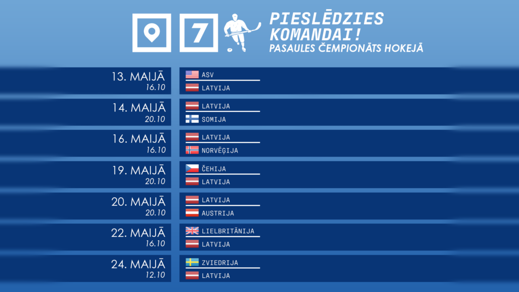 - 24. maijā plkst. 12.10 Latvija – Zviedrija (LTV7 Hokeja studija plkst. 11.30).