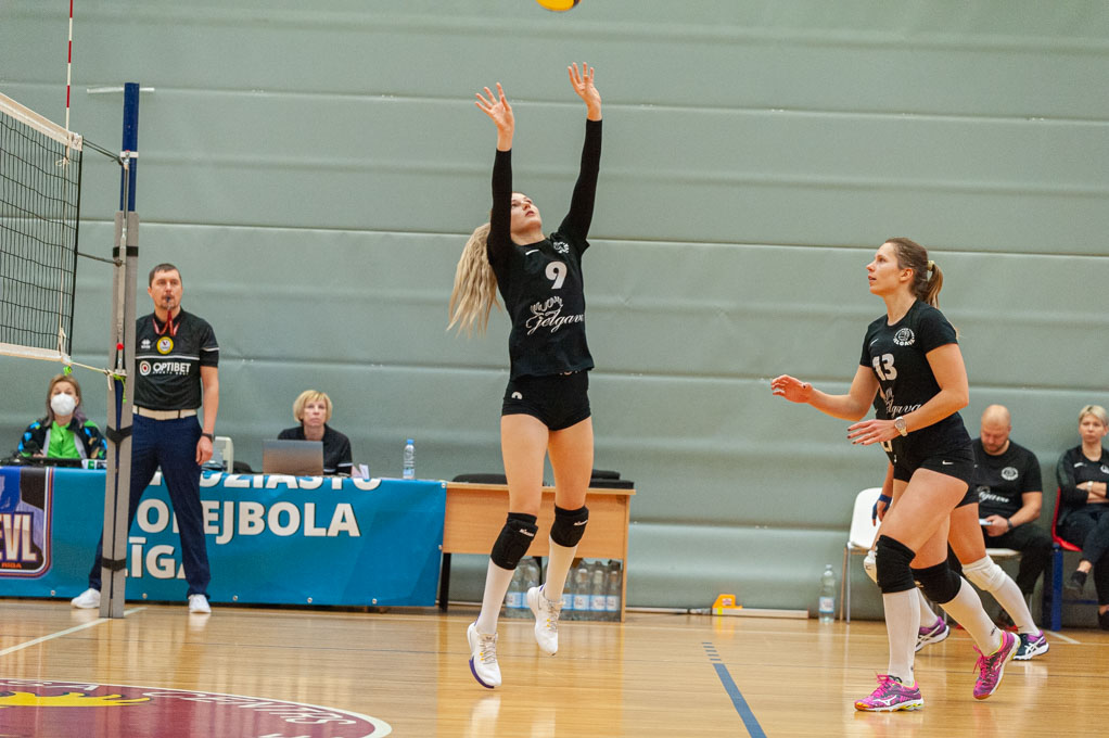 Pirmo setu daugavpilietes sāka ļoti apņēmīgi un vidusdaļā jau bija pārņēmušas iniciatīvu, ko mājiniecēm pat pēc apspriešanās divos pusminūtes pārtraukumos ar treneriem Aldi Bērziņu un Jāni Leiti neizdevās apslāpēt (13:15, 16:19, 17:22 un 18:25). Otrajā setā negaidītā pretspara pārsteigums jau bija acīm redzami pārvarēts, un jelgavnieču spēle iegāja paredzamajās sliedēs. Kopējo pārliecību vairoja komandas kapteines Lienes Šimkuses un Kristīnes Gabranovas rezultatīvā darbība (katrai attiecīgi pa 6 un 5 punktiem, tostarp 1 un 2 eisi), tuvojoties galotnei, mūsējām jau pārliecinošs 23:16 un noslēgumā 25:19. Trešajā setā viešņas jau šķita padevušās (15:25), tomēr iespaids izrādījās mānīgs, un pie 16:20 daugavpilietes veica pamatīgu izrāvienu, pirmās tiekot pat pie setbumbas. Jelgavniecēm atlika pierādīt, ka piektais sets nav viņu plānos, kas arī pēc sīksta cīniņa līdz 27:25 izdevās.