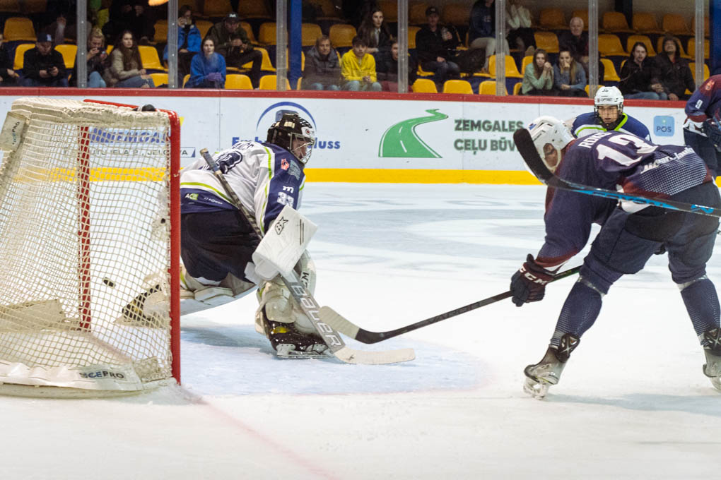 Sākums parādīja, ka abas komandas nopietni gatavojās čempionātam un noteikta pārsvara nebija nevienai no komandām. 5. minūtē Jelgavas Ledus sporta skolas audzēknis Kristers Vītoliņš devās drošā uzbrukumā un spēja apspēlēt viesu aizsargu Iļju Grekovu (bijušais Jelgavas komandas spēlētājs). Kristeram izdevās arī palaist ripu uz vārtu pusi un tai izdevās ieslīdēt starp Henrija Anča kājsargiem – 1:0.