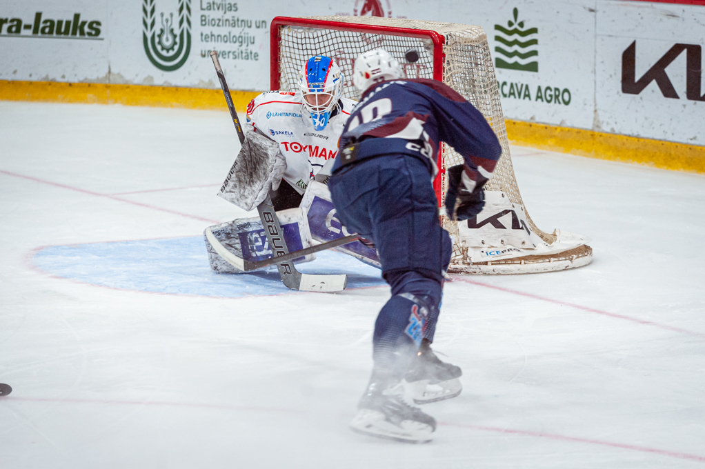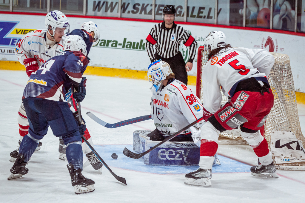 Savukārt “Hokki” veicās krietni labāk. Septītajā minūtē, spēlējot vairākumā, aizsargs Risto Matila ar metienu no zilās līnijas spēja pārspēt vārtsargu Ēriku Vītolu. Divas minūtes vēlāk viesu aizsargs Danila Trošin atkārtoja tālo metienu, dubultojot savas komandas pārsvaru.