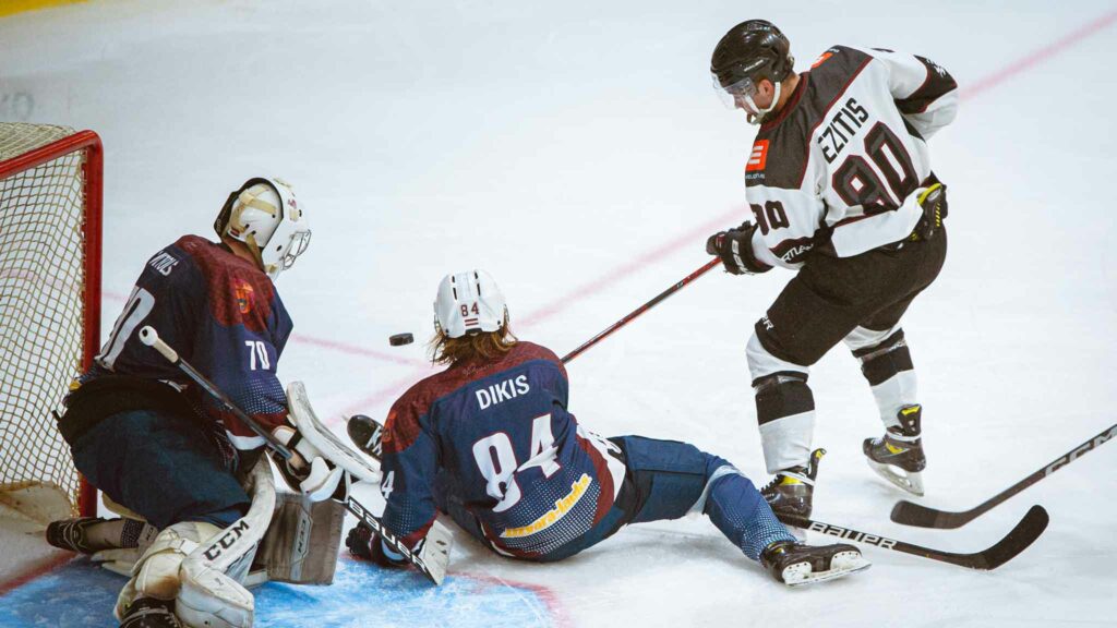 45 sekundes vēlāk “Dinamo Rīga” uzbrucējs Sandis Grinbergs izmantoja ripas atlekšanu no aizsarga slidas un pārspēja jelgavnieku vārtsargu Rihardu Cimermani un izlīdzināja rezultātu – 1:1.