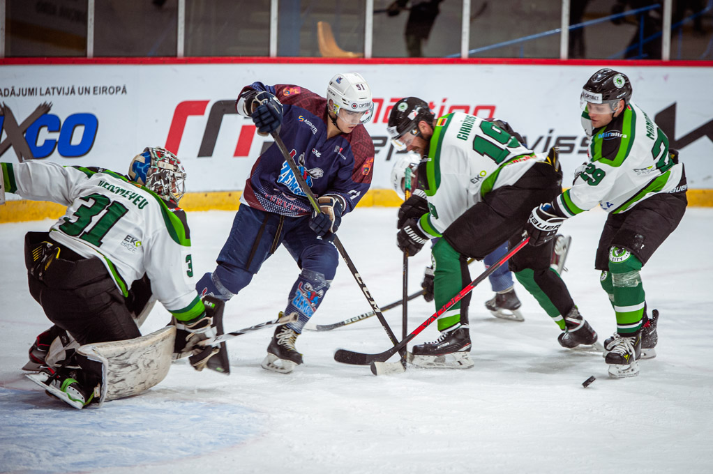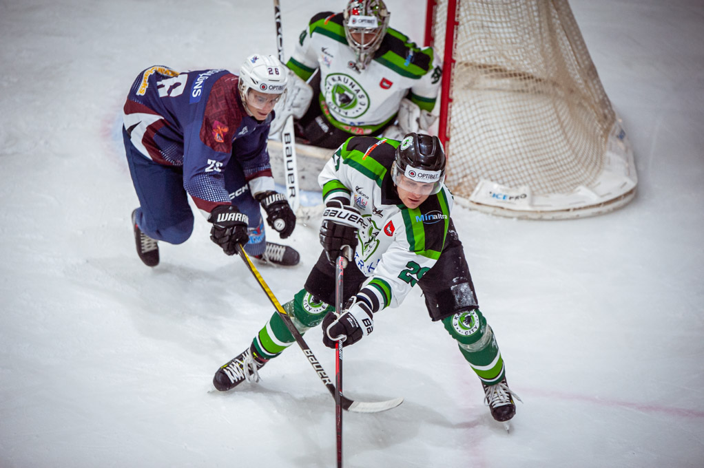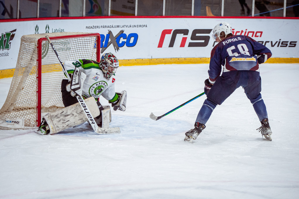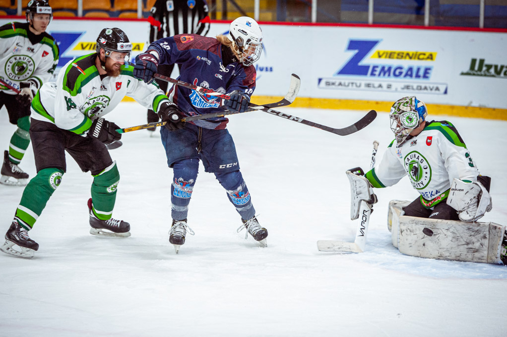 “Kaunas City” hokejisti spēles beigās vairākas reizes spēja aizskriet pret vienu vārtsargu Rihardu Cimermani, bet pieredzējušo hokejistu pārspēt nespēja.