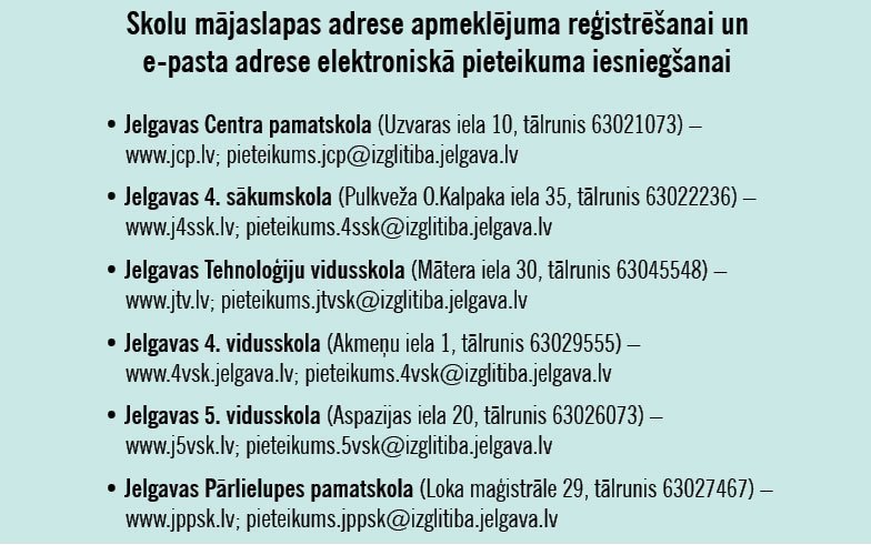 Paredzēts, ka Jelgavas 4. sākumskolā tiks uzņemti 180 pirmklasnieki, Jelgavas Centra pamatskolā, Jelgavas Tehnoloģiju vidusskolā, Jelgavas 4. vidusskolā – katrā 120, Jelgavas 5. vidusskolā – 84, Jelgavas Pārlielupes pamatskolā – 112 skolēni.