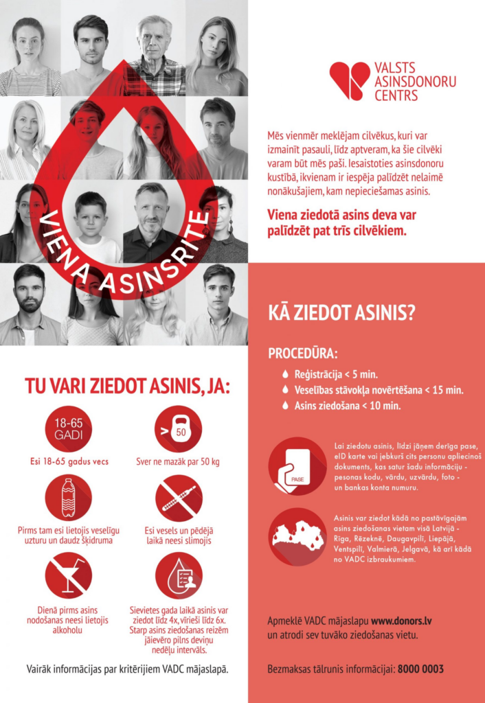 VADC vērš uzmanību, ka viena asins ziedošanas reize var izglābt trīs cilvēku dzīvības. Šobrīd VADC aicina atsaukties visu asinsgrupu donorus, bet īpaši 0- asinsgrupas donorus.