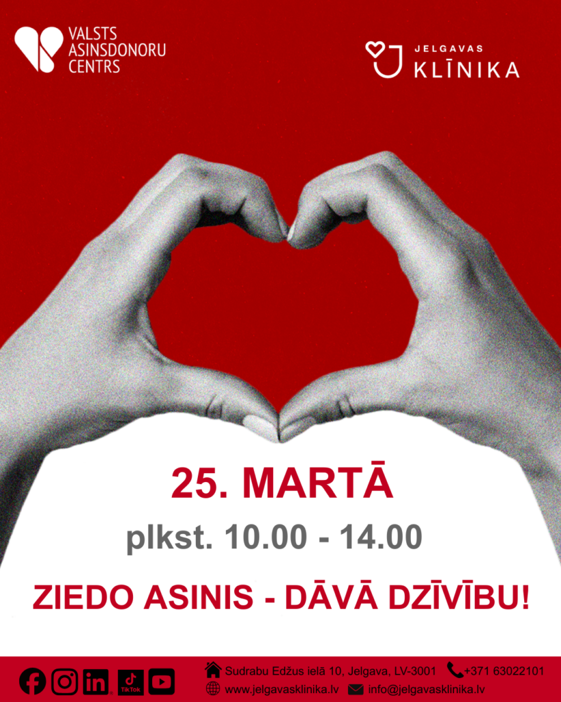 25. martā no pulksten 10 līdz 14 specializētajā autobusā pie Jelgavas klīnikas Sudrabu Edžus ielā 10 būs iespēja ziedot asinis, informē SIA “Jelgavas klīnika”. Donoru diena norisinās sadarbībā ar Valsts asinsdonoru centru (VADC).