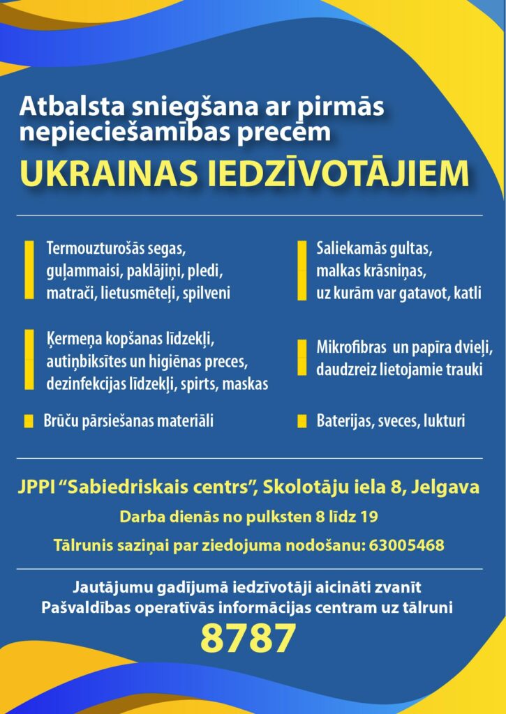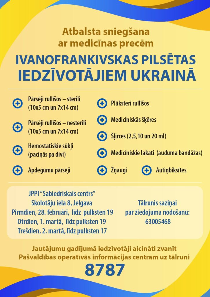 Lai atbalstītu Jelgavas sadraudzības pilsētas Ivanofrankivskas iedzīvotājus Ukrainā un solidarizētos ar Ukrainu un sniegtu atbalstu tās tautai kara apstākļos, ikviens aicināts iesaistīties, ziedojot medicīnas un pirmās nepieciešamības preces, informē Jelgavas pašvaldības Sabiedrisko attiecību pārvaldē.