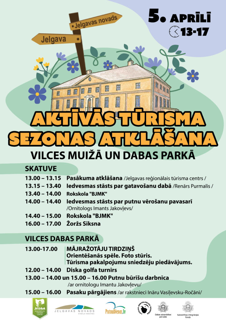 5. aprīlī no pulksten 13 līdz 17 apmeklētājus gaida Jelgavas reģionālā tūrisma centra (JRTC) un Jelgavas novada kopīgi organizētais aktīvās tūrisma sezonas atklāšanas pasākums Vilces muižas pagalmā un Vilces dabas parkā, informē Jelgavas valstspilsētas pašvaldības iestāde.
