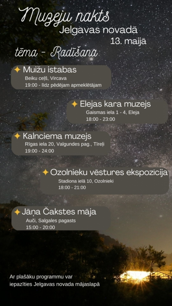 2023. gada 13. maijā norisināsies Eiropas Muzeju nakts. Šogad Muzeju nakts tēma ir “radīšana”, kas ietver gan jaunradi un atjaunošanu – dzīves uzlabošanu un dažādu lietu atjautīgu pārveidošanu, gan prasmju iepazīšanu un apgūšanu. Arī Jelgavas novadā muzeju naktī būs iespēja apmeklēt vairākas vietas, informē pašvaldība.