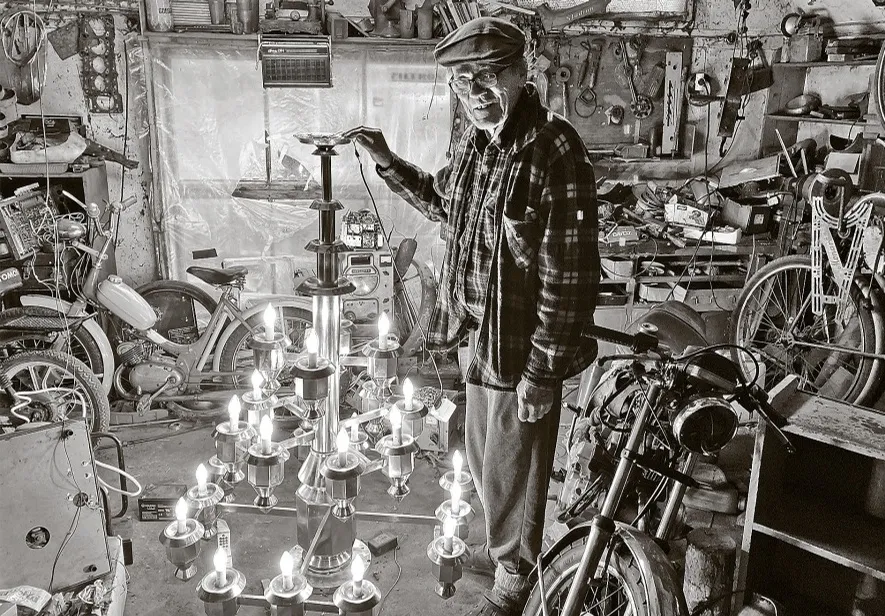 KĀRLIS DEGAINIS Valgundes pagasta Mierlaukos mehāniskajā darbnīcā, kur viņš atjaunoja baznīcas kroņlukturus. Foto: Juris Tolpežņikovs