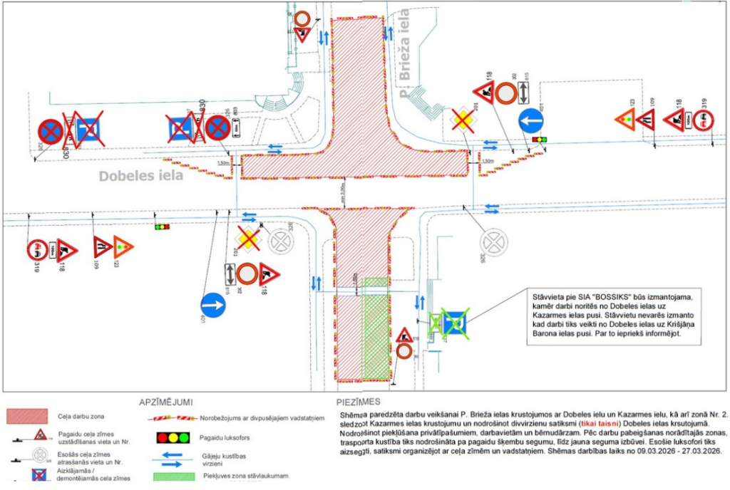 Stāvvieta pie SIA “Bossiks” būs izmantojama laikā, kamēr darbi noritēs no Dobeles ielas Kazarmes ielas virzienā. Savukārt, kad darbi tiks veikti no Dobeles ielas Krišjāņa Barona ielas virzienā, stāvvietu izmantot nebūs iespējams. “Pilsētsaimniecībā” norāda, ka par šīm izmaiņām iedzīvotāji tiks informēti.