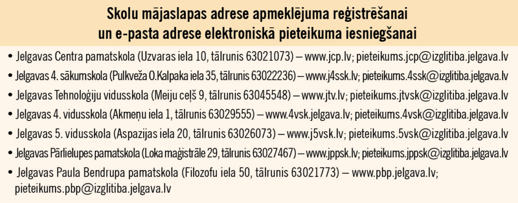 Bērnu reģistrācija 1. klasē 2024./2025. mācību gadam Jelgavas vispārizglītojošajās skolās sāksies 1. martā, bet Jelgavas 4. vidusskolas īstenotajās pamatizglītības programmās ar augstākiem sasniedzamiem rezultātiem mūzikā vai sporta ievirzi – 1. februārī. Reģistrēties varēs, iesniedzot pieteikumu elektroniski, vai klātienē, iepriekš apmeklējumu piesakot. 4. vidusskolā klātienes apmeklējumam, lai reģistrētu bērnu mācībām mūzikas vai sporta klasē, skolas mājaslapā varēs pieteikties no 15. janvāra, bet pārējās skolās reģistrācija klātienes apmeklējumam sāksies 12. februārī.