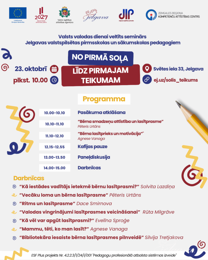 Ceturtdien, 23. oktobrī, Zemgales reģiona Kompetenču attīstības centrā Svētes ielā 33 notiks Valsts valodas dienai veltīts seminārs pirmsskolas un sākumskolas pedagogiem, kā arī skolu bibliotekāriem “No pirmā soļa līdz pirmajam teikumam”.