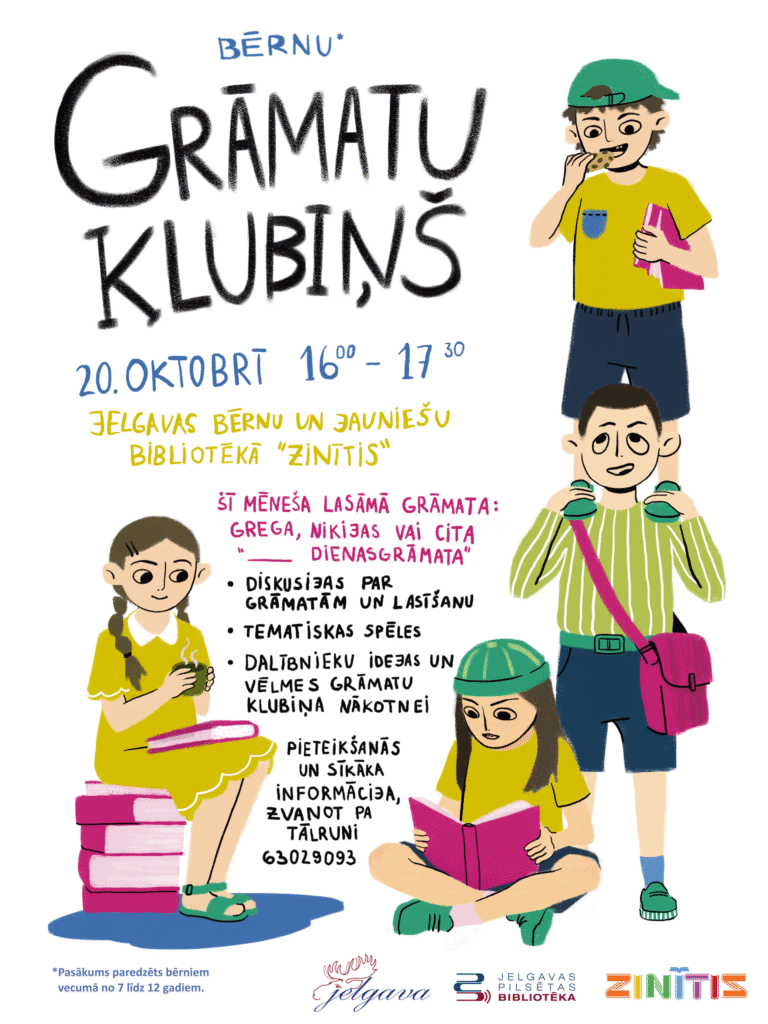Bērnu un jauniešu bibliotēka “Zinītis” Zemgales prospektā 7 Jelgavā aicina bērnus pievienoties grāmatu klubiņam. Jelgavas Pilsētas bibliotēka informē, ka pasākums paredzēts bērniem vecumā no 7 līdz 12 gadiem – gan tiem, kuri aizraujas ar lasīšanu, gan tiem, kuri ar grāmatām vēl ir uz “jūs”.