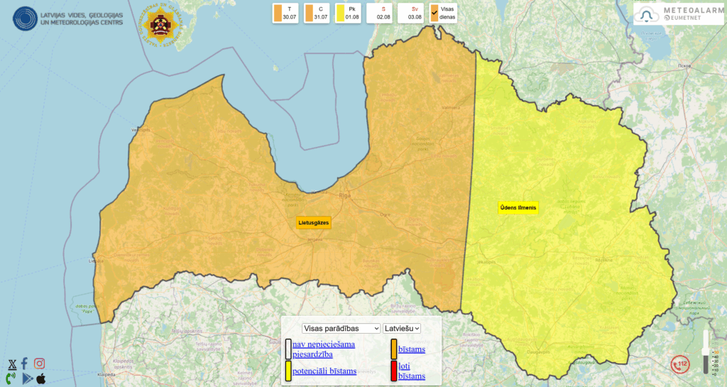 Šīs dienas vidū vietām valsts rietumu rajonos gaidāmas stipras lietusgāzes, bet vēlā pēcpusdienā no pulksten 16 līdz pulksten 20 Latvijā gaidāmas ļoti stipras lietusgāzes, vietām iespējams pērkona negaiss, krasas vēja brāzmas un krusa. Lietusgāzes turpināsies līdz 31. jūlija nakts pirmajai pusei.