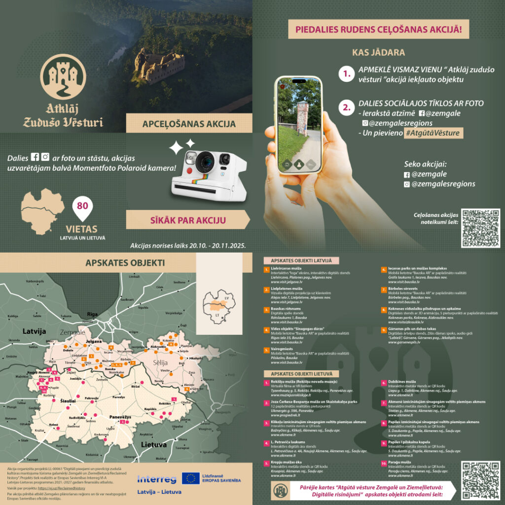 Zemgales reģionā un Ziemeļlietuvā izveidoti jauni digitāli risinājumi tūrisma objektos, kas ļauj interaktīvi ielūkoties vēsturē – redzēt senas ēkas, vietas un atklāt leģendārus stāstus, kas reiz bija zuduši, bet tagad kļuvuši pieejami ar modernu tehnoloģiju palīdzību. No 20. oktobra līdz 20. novembrim interesenti aicināti piedalīties ceļošanas akcijā “Atklāj zudušo vēsturi” un doties izzināt digitālos risinājumus tūrisma objektos Zemgalē un Ziemeļlietuvā.