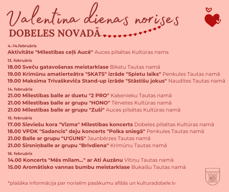 Savukārt 15. februārī pulksten 17 būs sieviešu kora “Vizma” Mīlestības koncerts Dobeles pilsētas Kultūras namā, pulksten 18 – VPDK “Sadancis” deju koncerts “Polka sniegā” Penkules Tautas namā, bet pulksten 21 balle ar grupu “U’GUNS” Jaunbērzes Tautas namā un sirsniņballe ar grupu “Brīvdiena” Krimūnu Tautas namā.