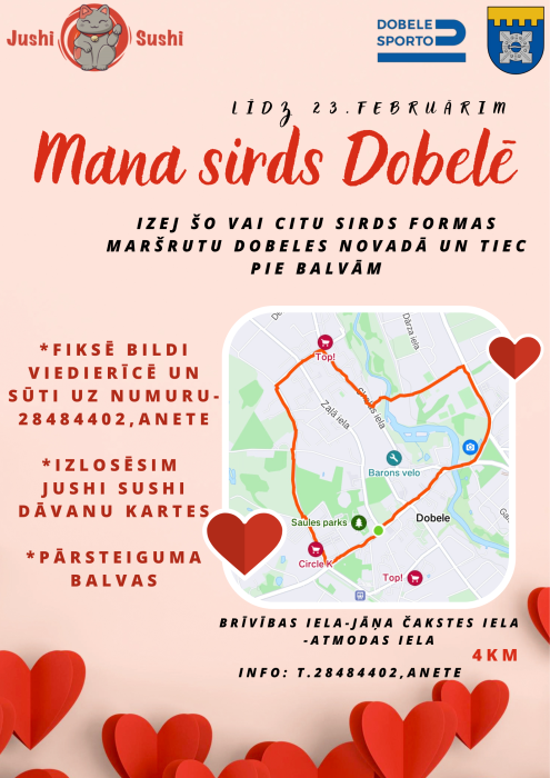Tāpat mīlestības mēneša laikā Dobeles novada Sporta pārvalde aicina doties īpašā pastaigā pa sirds formas maršrutu Dobelē, kas ved pa Brīvības, Jāņa Čakstes un Atmodas ielām. Līdz 23. februārim savs veikums ir jāiesūta Dobeles novada sporta pārvaldei. Mēneša beigās tiks izlozēti trīs laimīgie, kuriem būs iespēja iegūt “Jushi Sushi Dobele” dāvanu kartes, kā arī pārsteiguma balvas no Dobeles novada Sporta pārvaldes. “Seko savai sirdij un dodies ceļā,” aicina Dobeles novada Sporta pārvaldē.