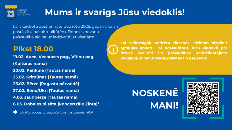 Lai iepazīstinātu ar šī gada pašvaldības budžetu un aktualitātēm, trešdien, 19. februārī, uz pirmo tikšanos ar Dobeles novada domes vadību un nozaru speciālistiem Auces pilsētas Kultūras namā tika aicināti Auces, Vecauces un Vītiņu pagasta iedzīvotāji, informē novada pašvaldība.