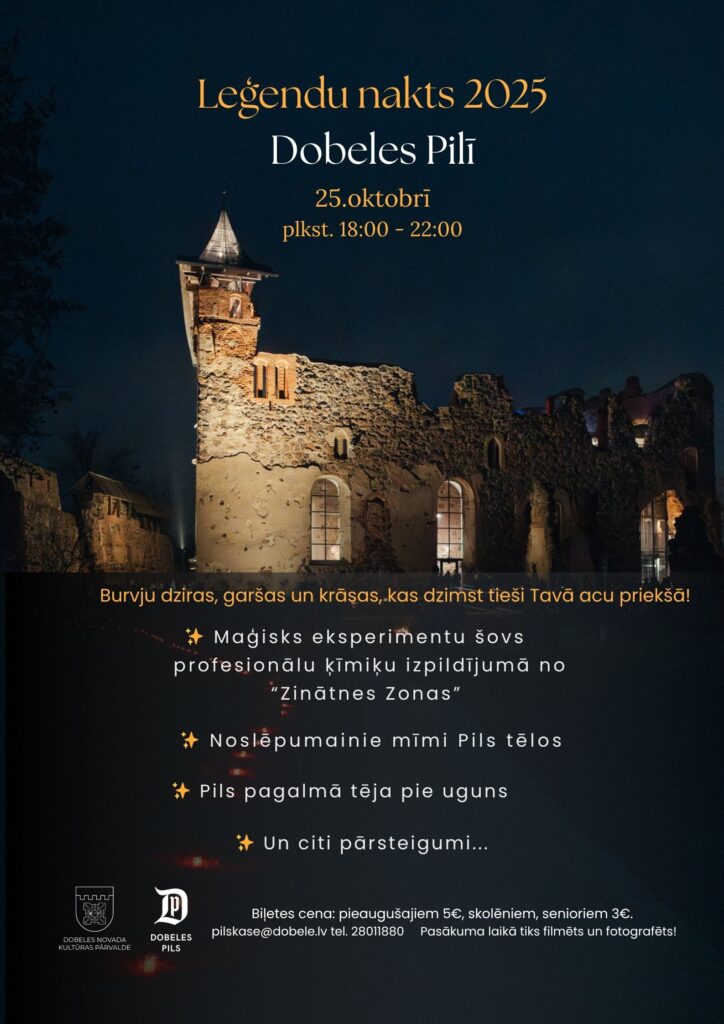 Kā ziņo Dobeles Pils projektu vadītāja Dace Smiltniece, sestdien, 25. oktobrī, pilī notiks pasākums “Leģendu nakts 2025”.