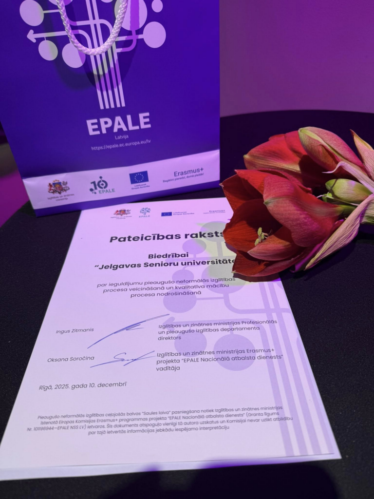 Vienlaikus Jelgavas Senioru universitāte saņēma IZM pateicības rakstu par ieguldījumu pieaugušo neformālās izglītības attīstībā.