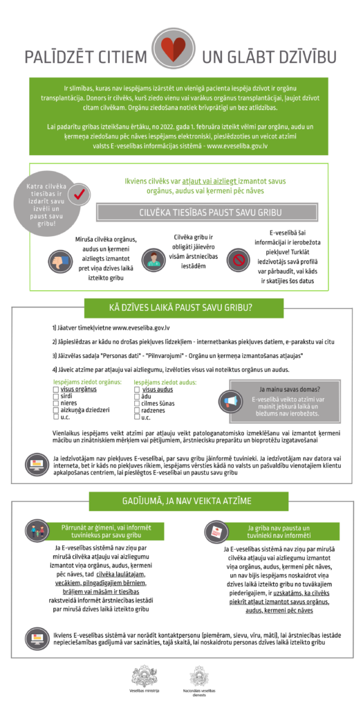 Vairāk informācijas par savas gribas izteikšanu var noskaidrot E-veselības tīmekļvietnes www.eveseliba.gov.lv sadaļā “Orgānu ziedošana”.