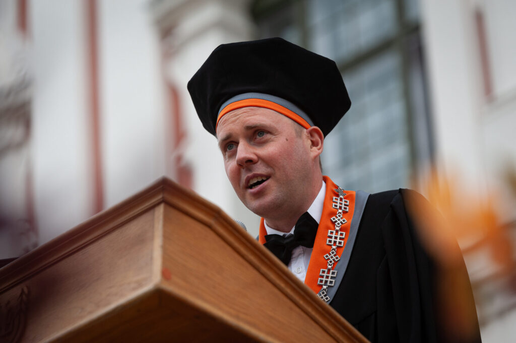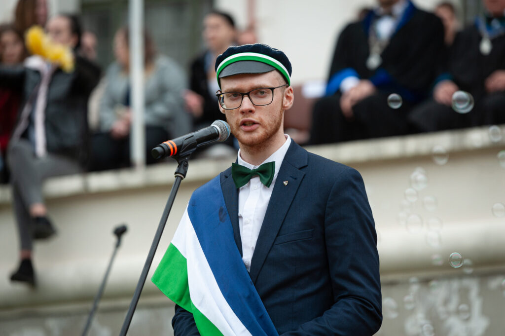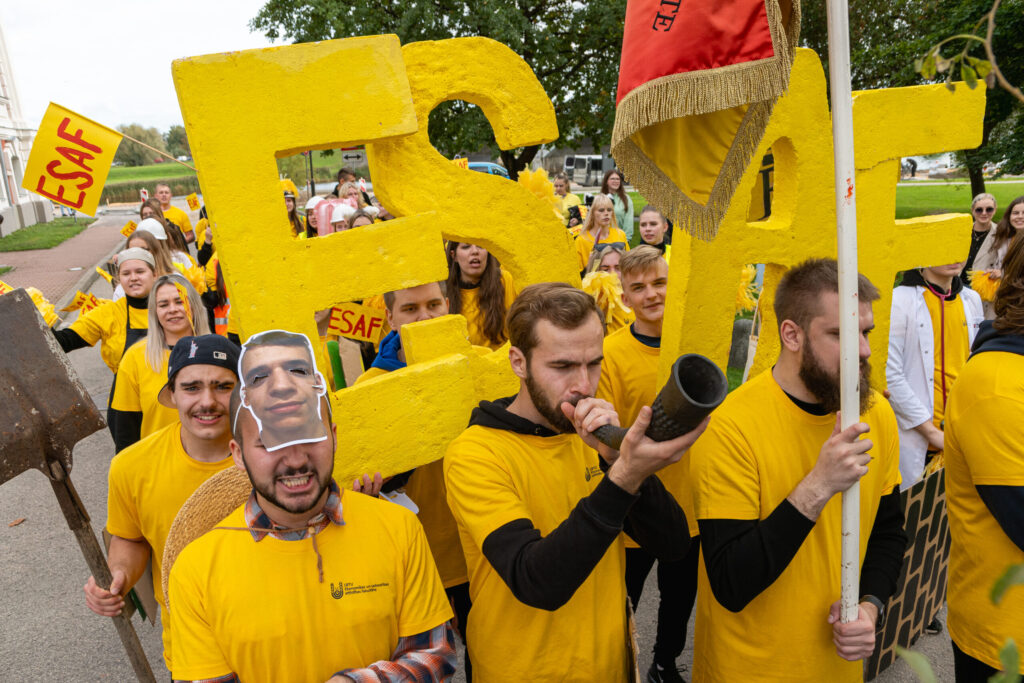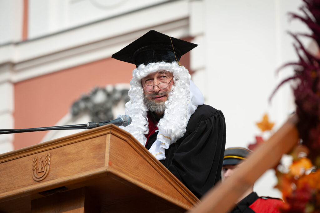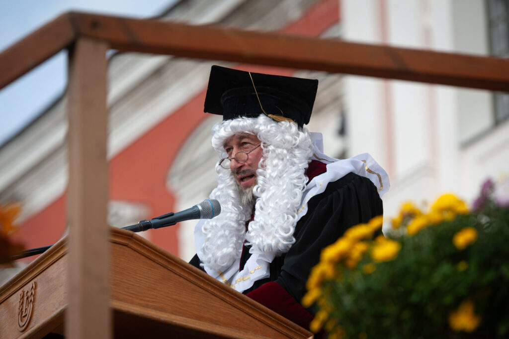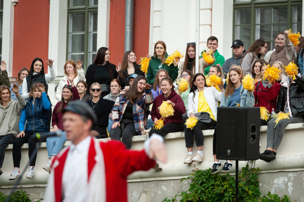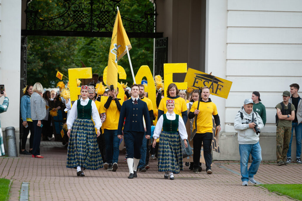 Pēcpusdienā pirmkursnieki izgāja ielās, lai soļotu uz Jelgavas pils pagalmu. Zinību vīrs Azemitologs, kuru jau astoto reizi atveidoja Latvijas Lauku konsultāciju un izglītības centra direktors Kaspars Žūriņš, pirmo reizi pasākumā ieradās elektroauto, nevis zirgu pajūgā.