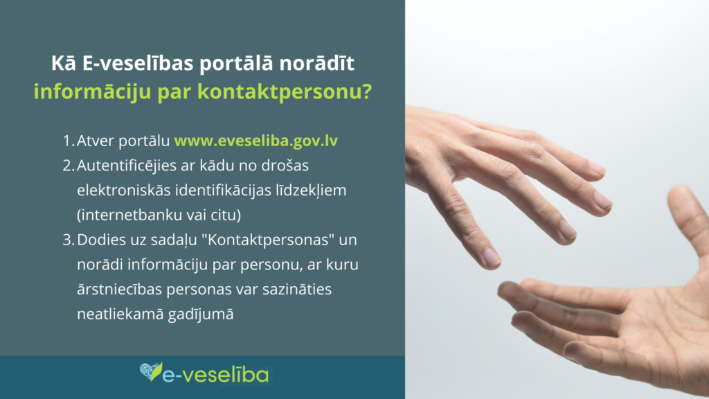 Lai E-veselības sistēmā norādītu savu kontaktpersonu saziņai neatliekamā gadījumā, jāautentificējas portālā www.eveseliba.gov.lv ar kādu no drošas elektroniskās identifikācijas līdzekļiem – internetbankas autentifikācijas līdzekļiem, elektroniskās identifikācijas karti (eID), droša elektroniskā paraksta (eParaksts) vai eParaksts mobile risinājumu. Kontaktpersonas informācija ir jānorāda sadaļā “Kontaktpersonas”.