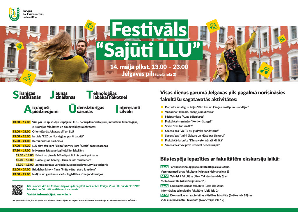 LLU ir biozinātņu un tehnoloģiju universitāte, kas īsteno pētījumus un augstākās izglītības programmas ar dabas resursu ilgtspējīgu izmantošanu saistītās nozarēs. Festivālā “Sajūti LLU” ikvienam būs iespēja iepazīt universitātes studiju iespējas kopā ar TV personību Aivi Ceriņu. No pulksten 13 līdz 17 vēsturisko Jelgavas pils pagalmu piepildīs universitātē studējošie un piedāvās ikvienam gan sirsnīgas sarunas un klātienes satikšanos, gan dažādus paraugdemonstrējumus un aizraujošas aktivitātes.