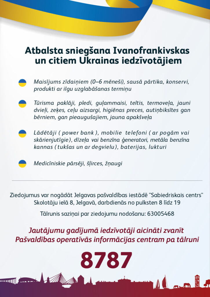 Turpinot atbalstīt sadraudzības pilsētu Ivanofrankivsku un Ukrainas iedzīvotājus, jelgavnieki aicināti sarūpēt pirmās nepieciešamības, sadzīves un medicīnas preces, lai pēc Jelgavas pilsētas svētkiem tās vestu uz Ukrainu. Ziedojumus var nogādāt Sabiedriskajā centrā Skolotāju ielā 8 katru darbdienu no pulksten 8 līdz 19.