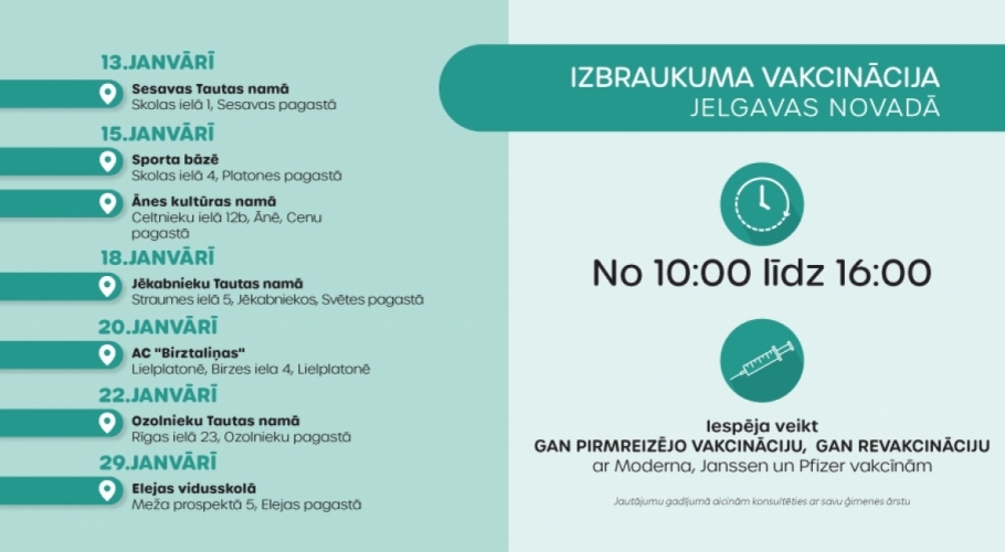 Būs iespēja veikt gan pirmreizējo vakcināciju, gan revakcināciju ar Moderna, Janssen un Pfizer vakcīnām, informē Jelgavas novada pašvaldība.