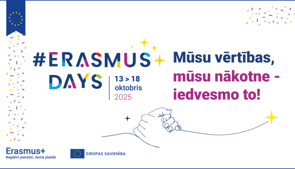 No 13. līdz 18. oktobrim visā Eiropā notiks sešas dienas ilgs pasākums – #ErasmusDienas. Arī Latvijā Erasmus+ projektu īstenotāji aicināti pievienoties svētkiem, organizējot daudzveidīgus pasākumus un daloties ar savu pieredzi, informē Valsts izglītības attīstības aģentūra.