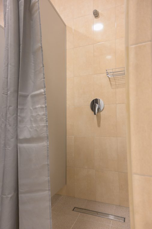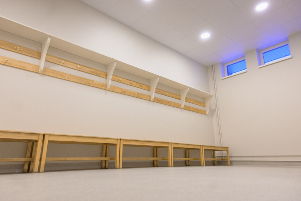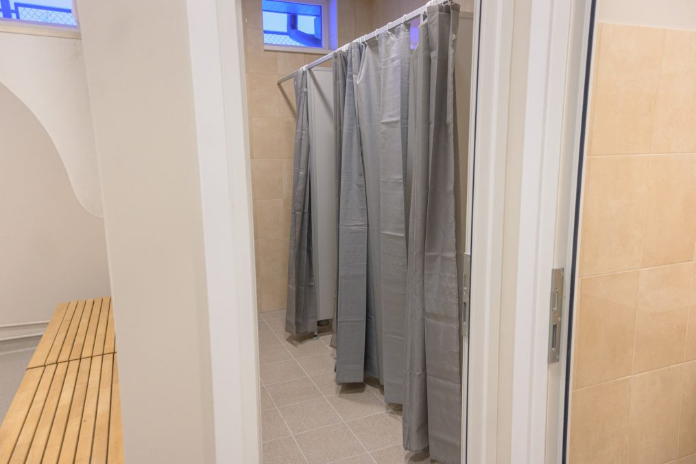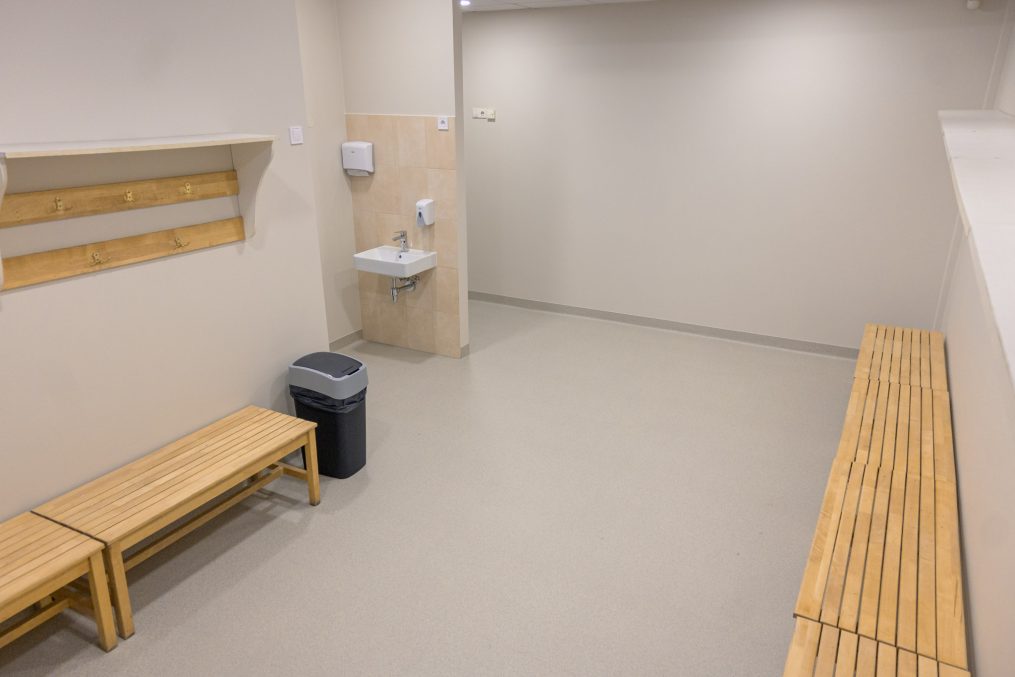 Ģērbtuvēs no jauna izbūvētas sienas, izveidotas un norobežotas dušu kabīnes, nomainīta santehnika, apgaismojums, ieklāts jauns grīdas segums un nomainītas durvis.