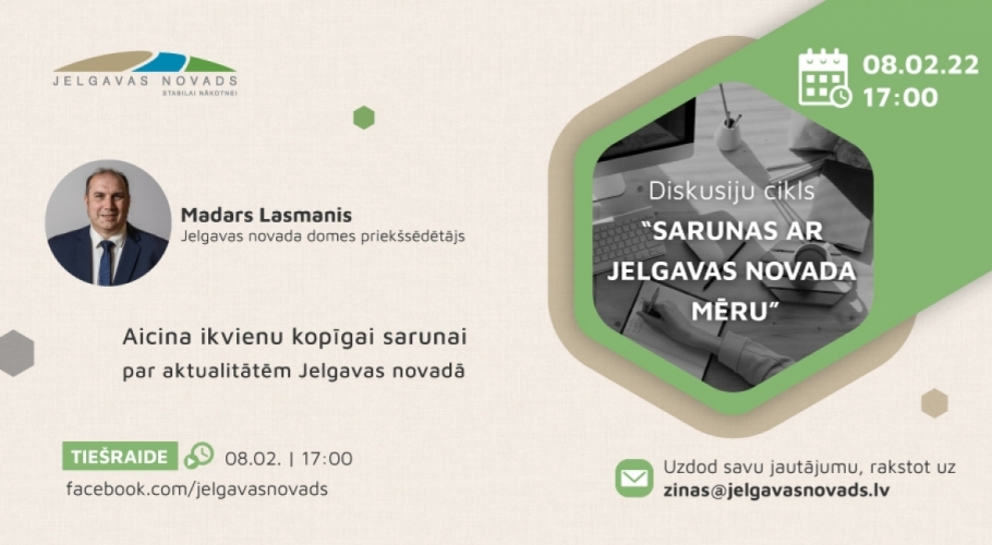 Lai pārrunātu novadniekiem aktuālākās pašvaldības problēmas un risinājumus, Jelgavas novada domes priekšsēdētājs ar diskusiju ciklu “Sarunas ar Jelgavas novada mēru” sāks jaunu tradīciju – ik mēnesi iedzīvotājus aicinot tikties “Facebook” tiešraidēs.