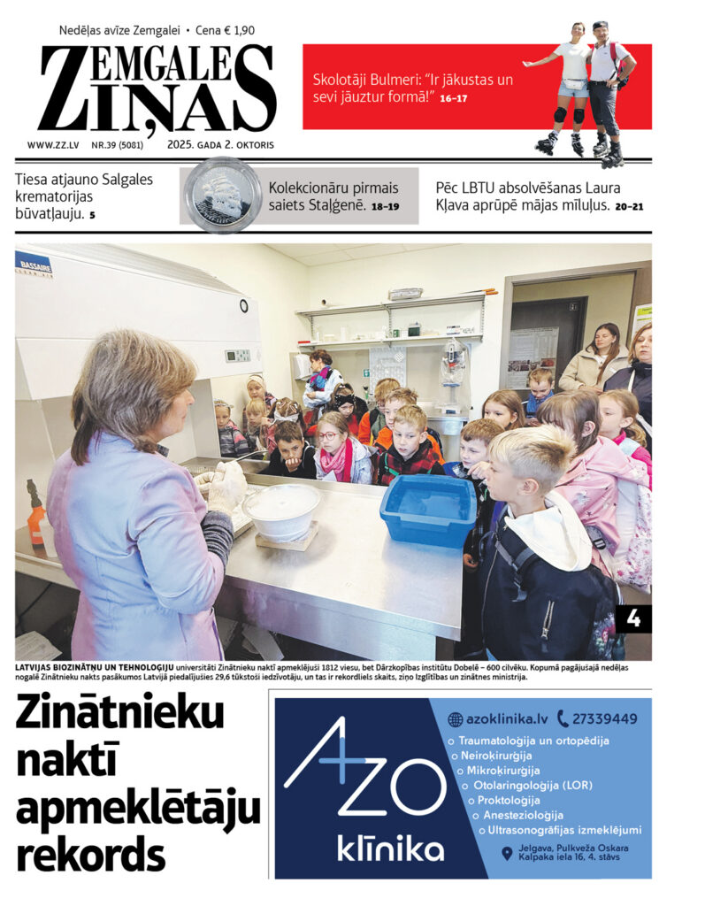 Jaunākajā laikraksta “Zemgales Ziņas” numurā (02.10.2025) lasiet: *Zinātnieku nakts pulcina rekordlielu apmeklētāju skaitu. *Ziedu burvība pāri gadiem un kontinentiem: Ilzes Šēnbergas izstāde “Ciemos. Mājās.” *Skolotāji Bulmeri: “Ir jākustas un sevi jāuztur formā!” *Kolekcionāru pirmais saiets Staļģenē. *Veterinārārste Laura Kļava pie pacientiem dodas mājas vizītēs.