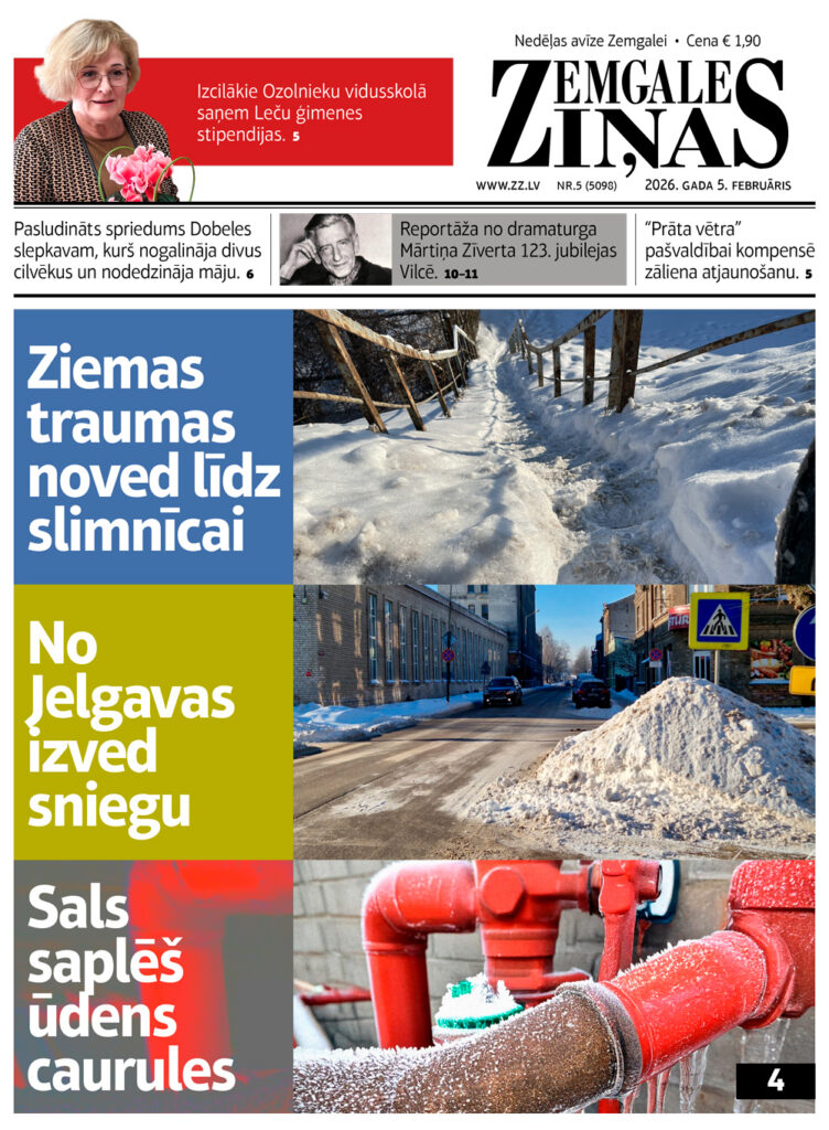 Jaunākajā laikraksta “Zemgales Ziņas” numurā (05.02.2026) lasiet: *Reportāža no dramaturga Mārtiņa Zīverta 123. jubilejas Vilcē. *Izcilākie Ozolnieku vidusskolā saņem Leču ģimenes stipendijas. *Saruna ar mūziķi Vladimiru Ivanovu jeb Electricano. *Līvbērzes novadpētniecības krājumā sākta vēstures liecību sakārtošana. *Maira Cine karjeru redz dejā.
